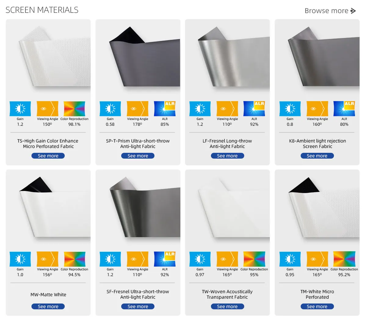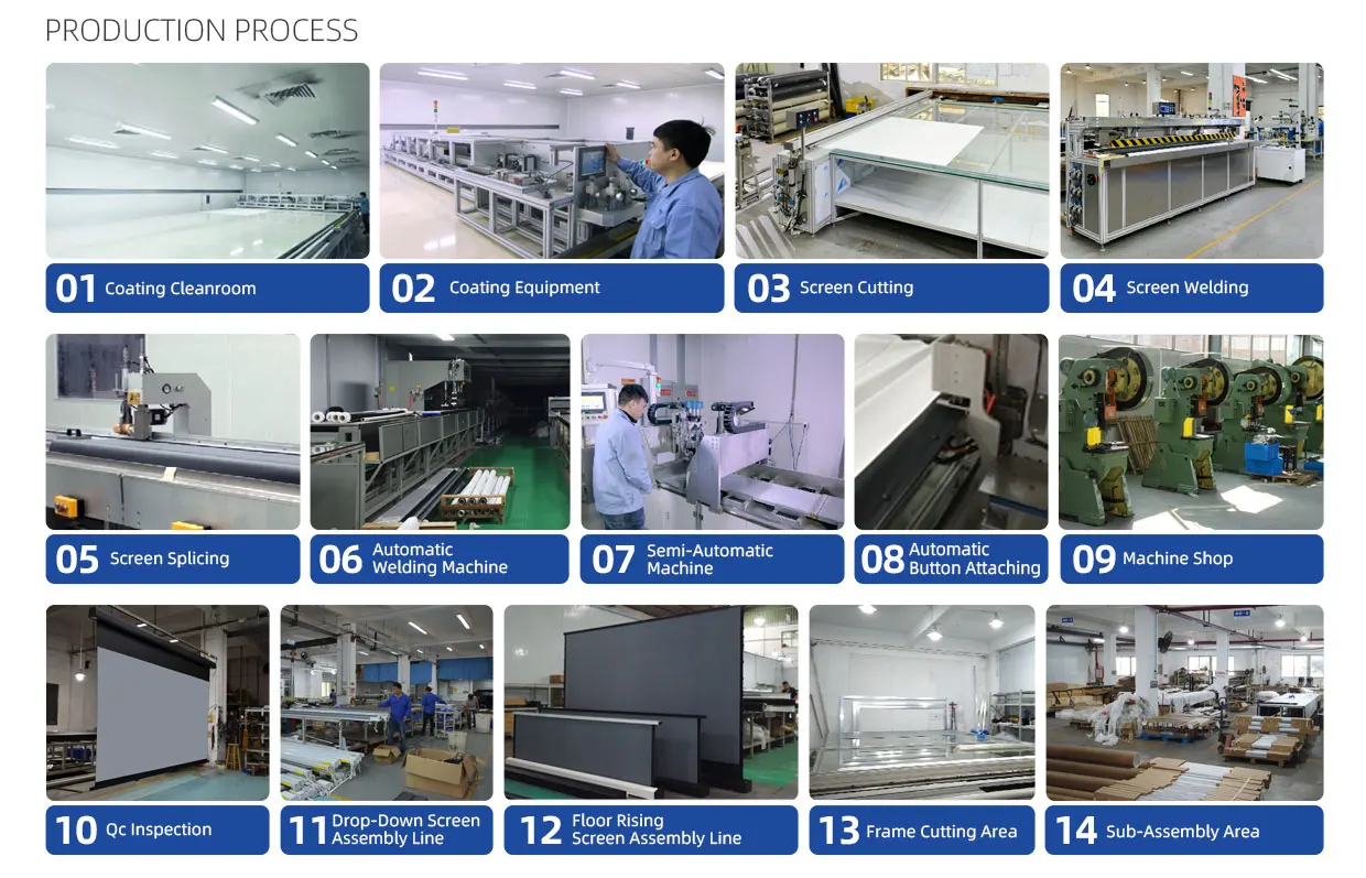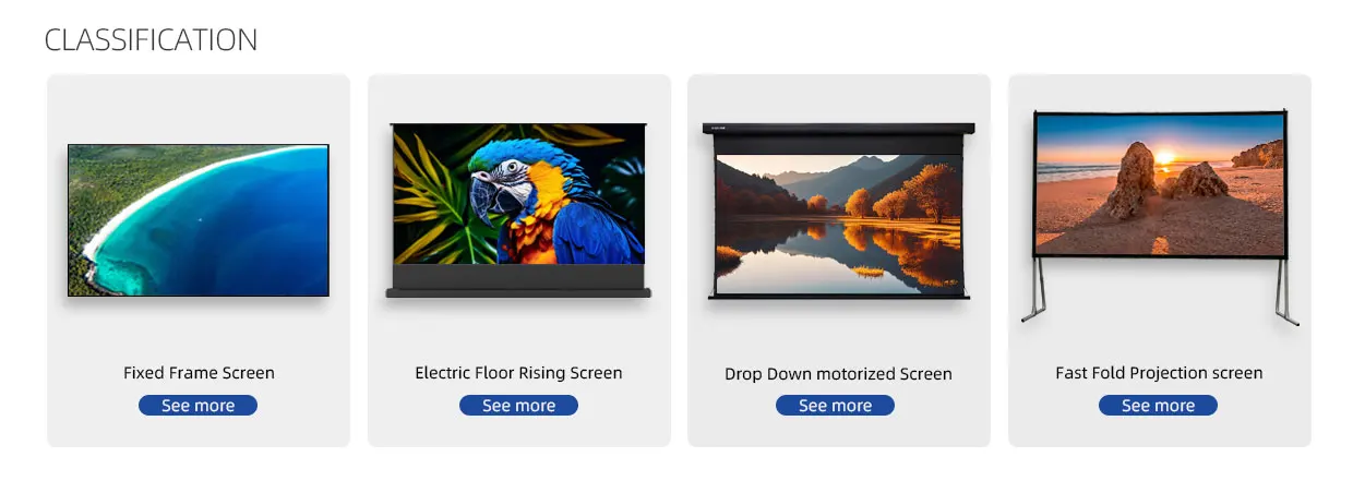 Productos principales:Pantallas motorizadas/eléctricas, pantallas de rechazo de luz ambiental, pantallas acústicamente transparentes, pantallas de proyección de marco fijo, pantallas de proyector portátiles para exteriores